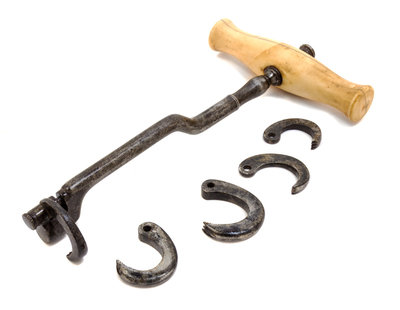 having a turned handle, cranked shaft and an adjustable claw with four additional claws.
