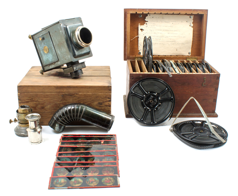 with a fitted case and glass slides, together with a wood case of celluloid film reels.