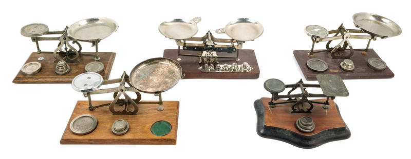 each with a scale pan and additional weights, together with a cast metal example.