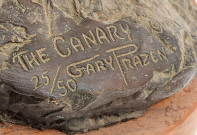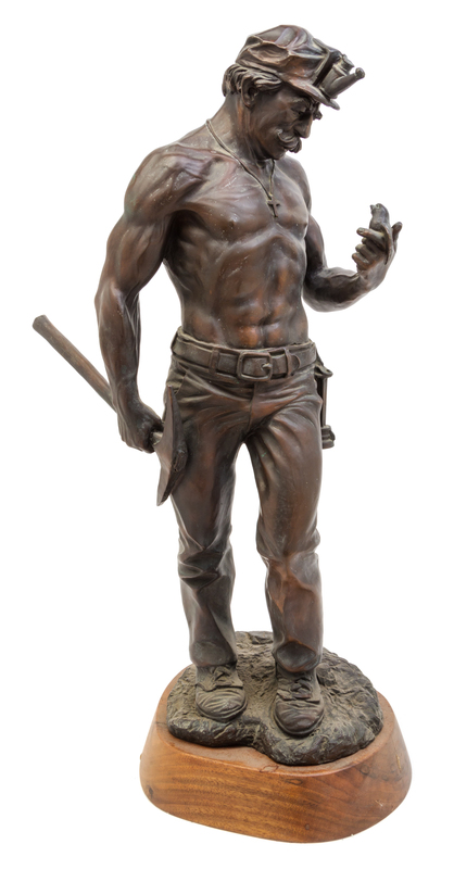 depicting a miner holding a canary, raised on a wood base.