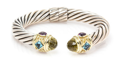 consisting of a cable measuring approximately 10.00 mm wide, the gold finials containing two rose cut lemon quartz, two square rose cut blue topaz and four oval mixed cut amethyst, with a hinge.Stamp: D.YURMAN 925 750.