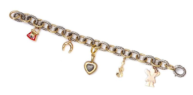consisting of alternating silver oval cable links and yellow gold oval links measuring approximately 12.00 mm wide, suspending a 14 karat yellow gold and polychrome enamel pure charm, a 14 karat yellow gold horse shoe charm, a sterling silver and 18 karat yellow gold cable heart charm containing four round brilliant cut diamonds, a yellow gold violin charm, together with a 14 karat rose and yellow gold girl charm containing three round brilliant cut diamonds. Stamp: DY 925 750.