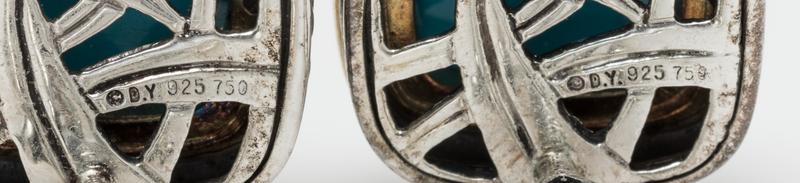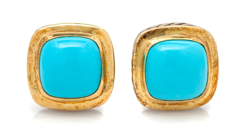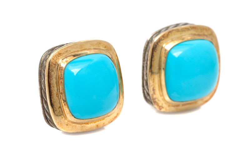 containing two cushion shape cabochon cut turquoise measuring approximately 6.97 x 7.07 mm.Stamp: (DY maker's mark) 925 750 M.