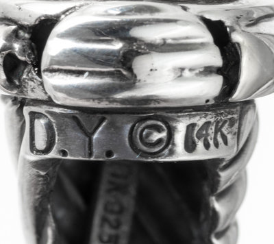 consisting of a cable design with gold domed top.Stamp: D.Y. 14K 925.