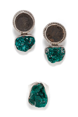 consisting of a ring containing one synthetic emerald crystal, together with a pair of earclips containing two synthetic emerald crystals and two ancient coins.Stamp: Rebecca Collins Sterling DALLAS TEXAS.
