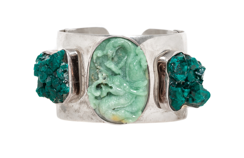 consisting of a polished cuff measuring approximately 50.00 mm wide and surmounted with two synthetic emerald crystals and a dragon motif carved jade plaque.Stamp: REBECCA COLLINS BLESS OUR EARTH STERLING AB IMO PECTORE DALLAS TEXAS.