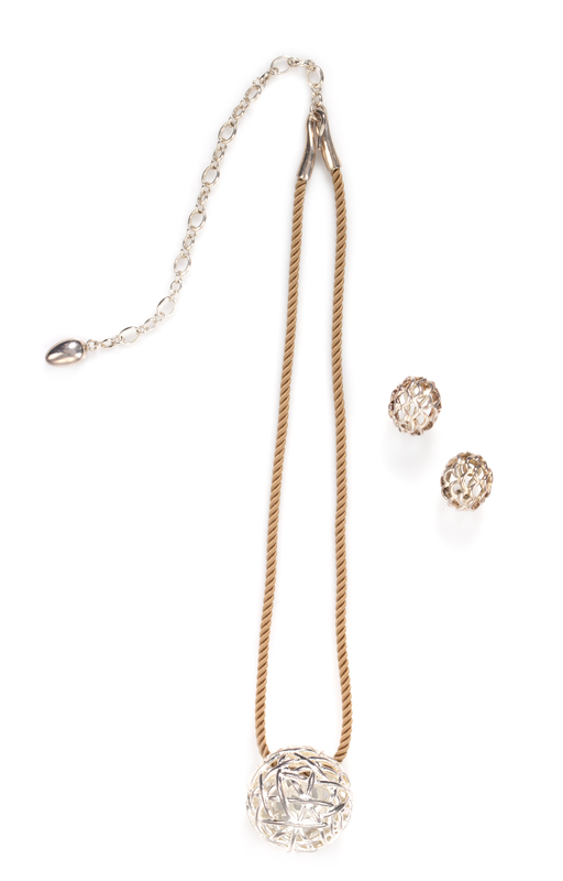 consisting of a hollow wrapped ball design pendant suspended on a taupe colored satin cord with silver hook and chain closured, together with a pair of oval shape hollow design earclips with a wave design, posts with a clip back.Necklace stamp: ACSTUDIO 925 THAILAND.Earrings stamp: CUMMINGS 1992 295.Accompanied by a pouch signed ANGELA CUMMINGS BERGDORF GOODMAN.