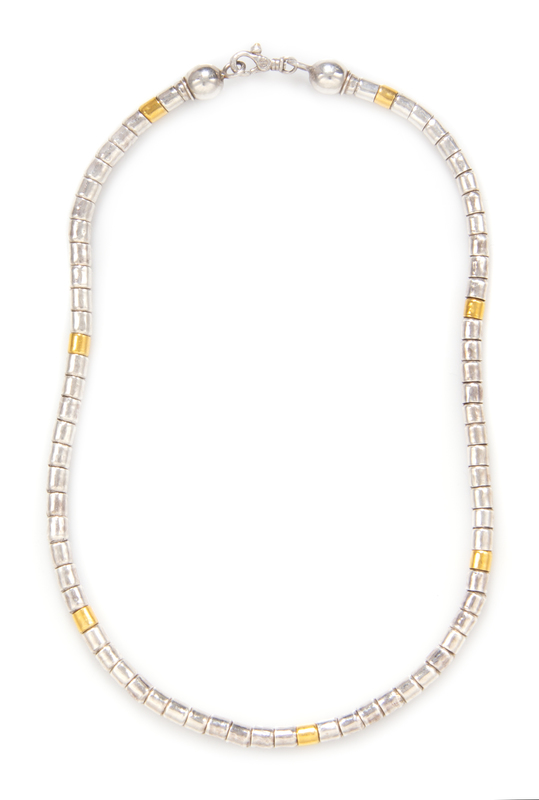 containing numerous tubular silver and seven gold beads strung on cord Stamp: 990 (maker's mark for Gurhan).