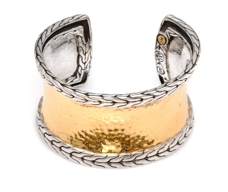 with braided chain edging, the center containing a hammered texture veneer of 22 karat yellow gold, measuring approximately 41.00 mm in width.Stamp: 22K 925 (John Hardy maker's mark).