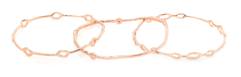 consisting of a bangle bracelet containing five round brilliant cut diamonds weighing approximately 0.15 carat total, together with two bangle bracelets with open oval ring designs.Stamp: 925 Ippolita Rose.