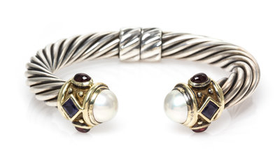 consisting of a cable measuring approximately 10.00 mm wide, the gold finials containing two mabe pearls, four square cut iolites and four oval cabochon garnets, with a hinge.Stamp: D.YURMAN 925 585.