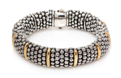 measuring approximately 14.00 mm wide, consisting of oval beaded rings alternating with gold topped silver polished rings.Stamp: 750 925 Caviar (maker's mark).