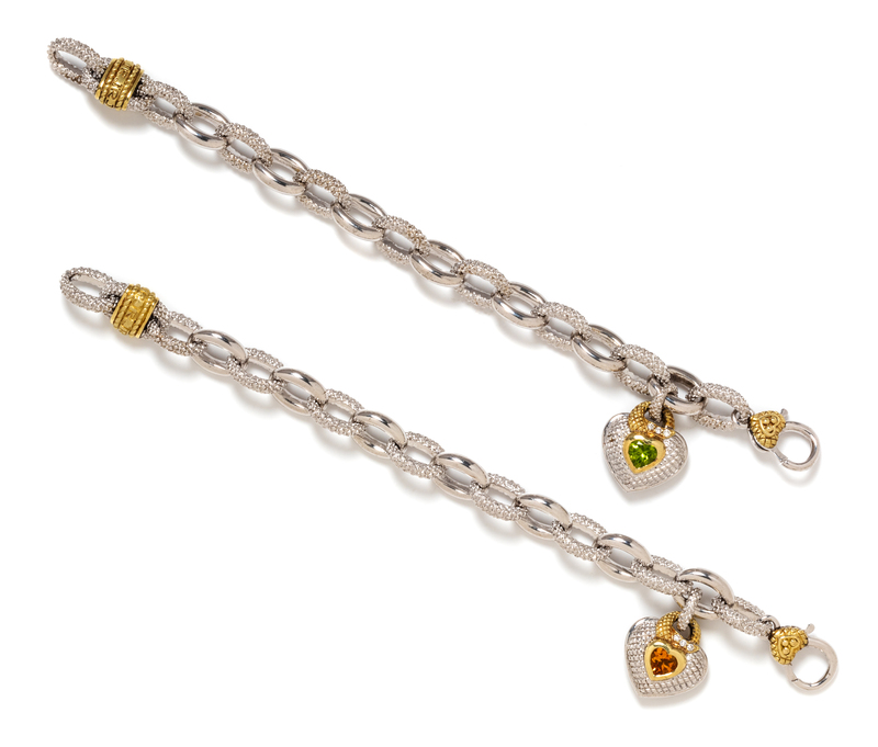 consisting of a bracelet with alternating polished and textured links and suspending a heart shaped charm containing one heart shape mixed cut golden citrine and two round brilliant cut diamonds, together with a matching bracelet of alternating polished and textured links and suspending a heart shaped charm containing one heart shape mixed cut peridot and two round brilliant cut diamonds.Stamp: JR TWO 18K 925.