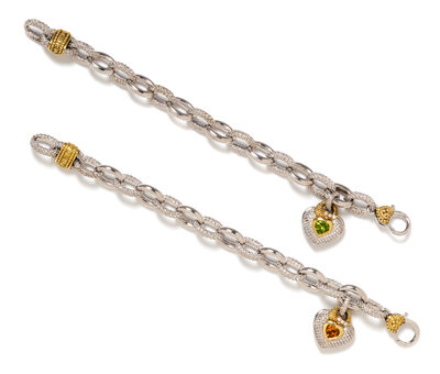 A Pair of Sterling Silver, 18 Karat Yellow Gold, Golden Quartz, Peridot and Diamond Bracelets, Judith Ripka,