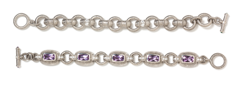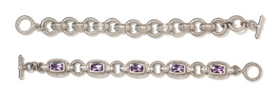 consisting of a bracelet with alternating textured domed and round links containing four round brilliant cut CZ's, together with a bracelet consisting of alternating textured rectangular and round link containing five rectangular checkerboard cut amethysts and 30 round brilliant cut CZ's.Stamp: 925 JUDITH RIPKA CZ THAILAND.