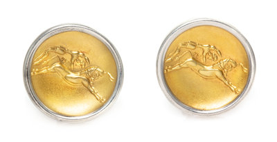 consisting of a central concave gold plaque with the image of a figure leaping over a bull, clip backs only.Stamp: (maker's mark for Lalaounis) A21 925.