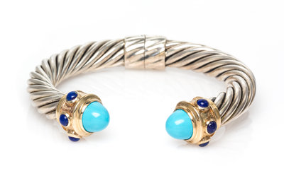 consisting of a cable measuring approximately 10.00 mm wide, the gold finials containing two cabochon cut turquoise and six round cabochon cut lapis lazuli.Stamp: STERLING 14K D.YURMAN.