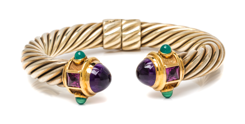 consisting of a cable measuring approximately 10.00 mm wide, the gold finials containing two cabochon cut amethysts, four round cabochon cut green onyx and two square cut amethysts.Stamp: 14K YURMAN STERLING.