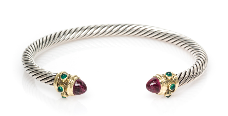 consisting of a cable measuring approximately 5.00 mm wide, the gold finials containing two cabochon cut pink tourmaline and six round cabochon cut green onyx.Stamp: YURMAN 14K STERLING(obscured).