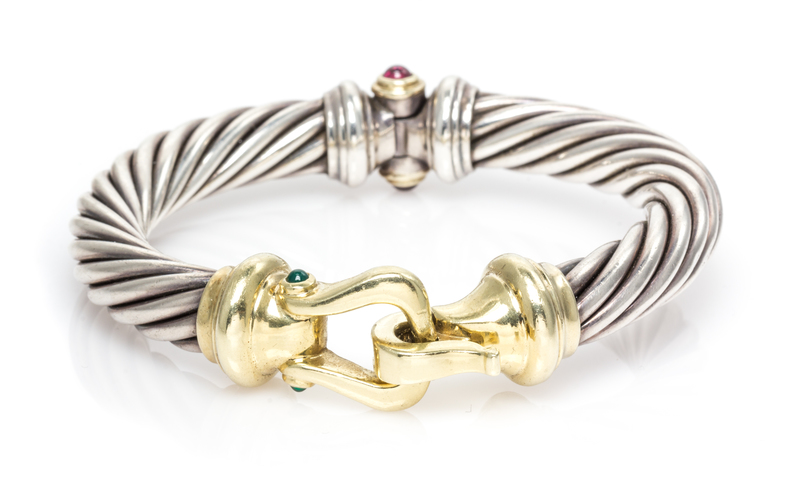 A Sterling Silver, 14 Karat Yellow Gold, Green Onyx and Garnet 'Buckle' Bracelet, David Yurman,