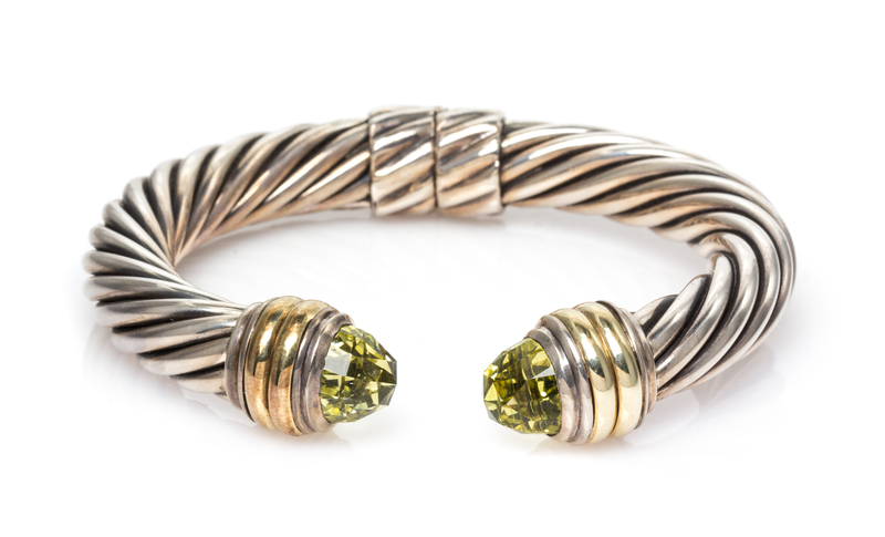 consisting of a cable measuring approximately 9.00 mm wide, the gold finials containing two rose cut lemon citrine finials, with a hinge.Stamp: 585 D.YURMAN STERLING.
