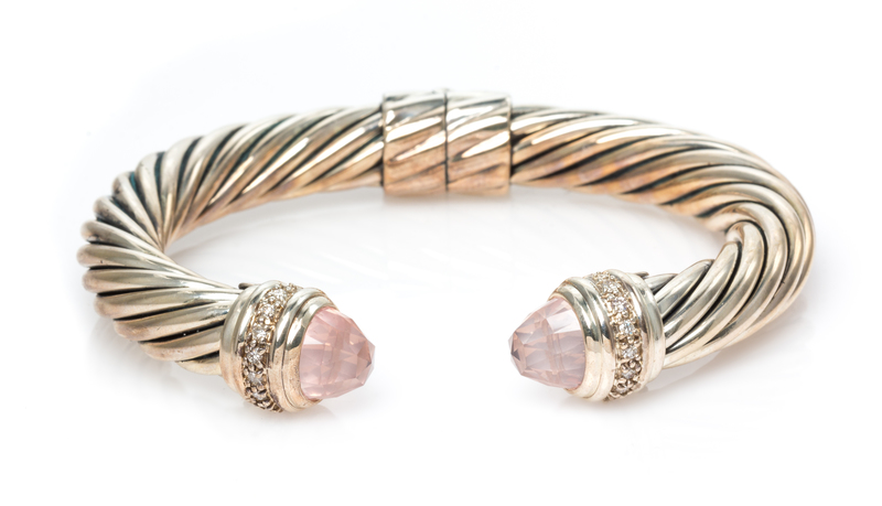 consisting of a cable measuring approximately 10.00 mm wide, the finials containing two rose cut rose quartz and 16 round brilliant cut diamonds, with a hinge.Stamp: D.Y. 925.