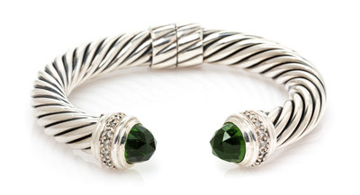 consisting of a cable measuring approximately 10.00 mm wide, the finials containing two rose cut chrome diopside and 16 round brilliant cut diamonds, with a hinge.Stamp: D.Y. 925.