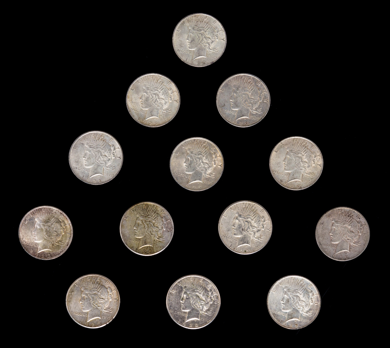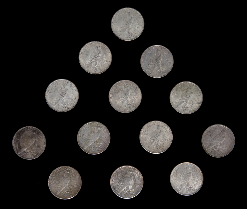 A Group of Thirteen United States Peace Silver Dollar Coins