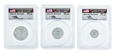 each PCGS graded PR70 DCAM and comprising 1/2 oz., 1/4 oz. and 1/10 oz. examples, each grading tag autographed by Chief Engraver John Mercanti.