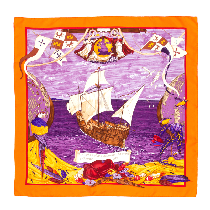 "Christophe Colomb Decouvre l'Amerique" pattern, designed by Carl de Parcevaux. Together with a box. Labeled within the print: Herms.