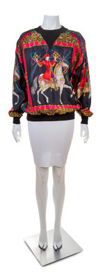 "Feux d'Artifice" pattern, designed by Michel Duchene, with a black cashmere ribbed neckline, waistband and cuff.Labeled: Herms.