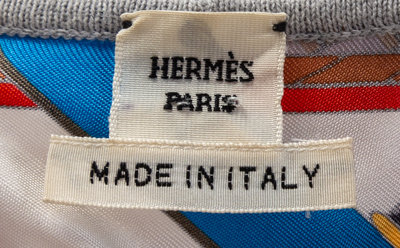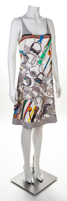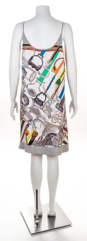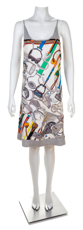 "Concours d'Etriers" pattern, designed by Virginie Jamin, with a scoop neckline, an A-line silhouette, spaghetti straps and grey cotton trim.Labeled: Herms.