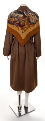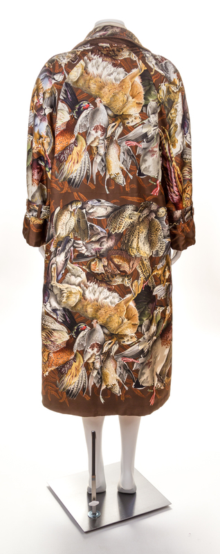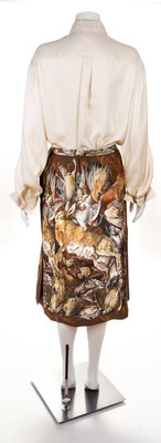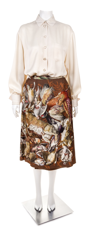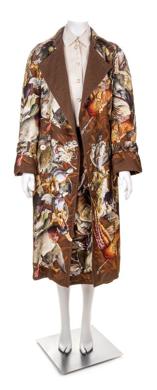 comprised of a double breasted coat with "Gibiers" pattern, designed by by Henry de Linares, with slip pockets, matching reversible waist tie and silk cuff straps; together with a reversible matching wrap skirt with button closure, a cashmere "Gibiers" pattern scarf and a cream blouse with front logo button closure. Each labeled: Herms. Scarf labeled within the print: Herms.