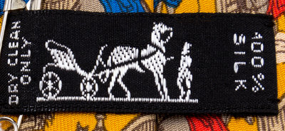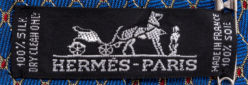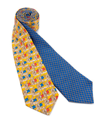 one blue with a diamond motif; one marigold with a horse stable motif. Each labeled: Herms.