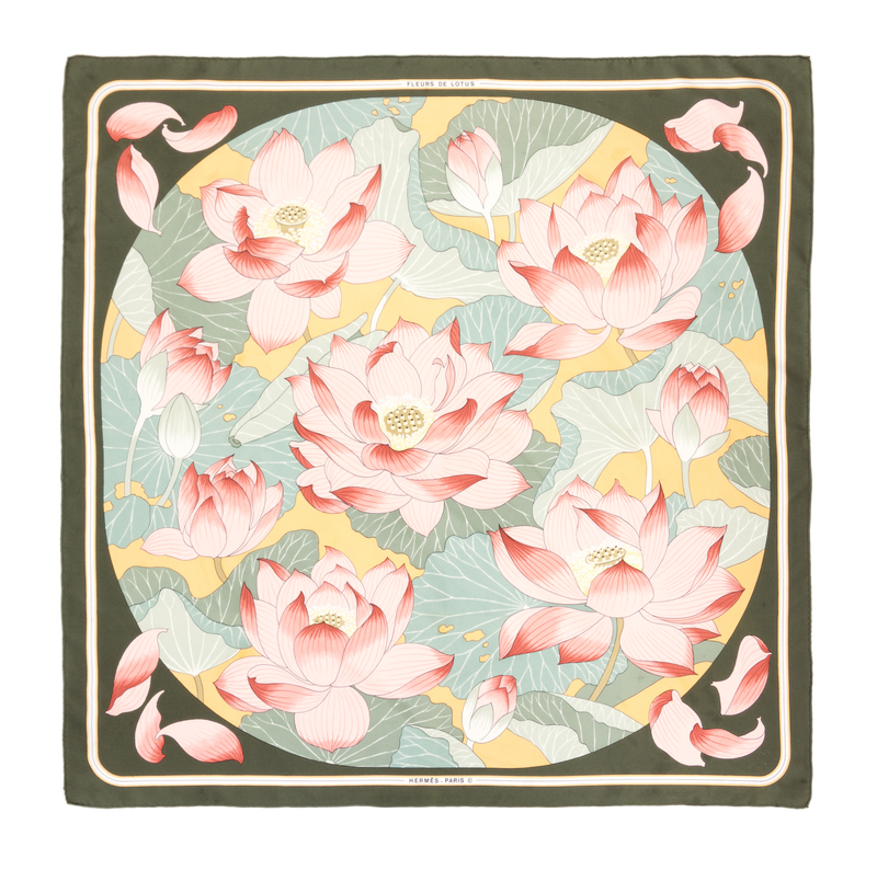 "Fleurs de Lotus" pattern, designed by Christiane Vauzelles. Together with a box.Labeled within the print: Herms.