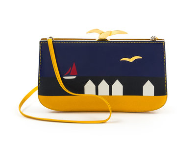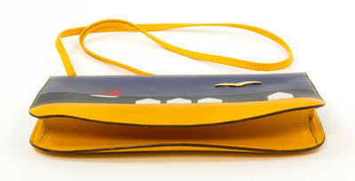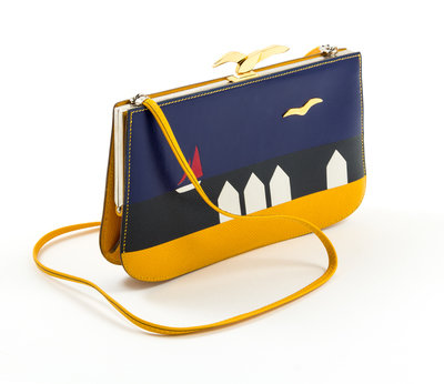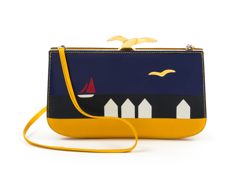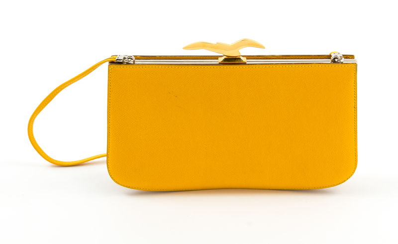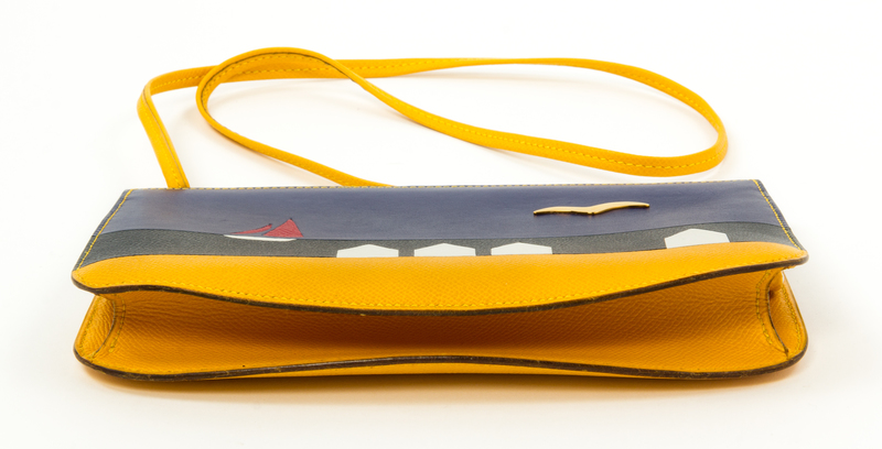 1988-1989,with yellow and multicolor courchevel and box calf leather, a graphic print on the front, palladium hardware, a decorative goldtone bird push lock top closure, an optional flat shoulder strap, tonal leather lining and three slip pockets at the interior wall. Circle S blindstamp.Stamped: Herms.