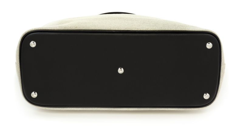 2014, with a black vache leather overlay, natural toile canvas body, dual rolled top handles, silver hardware, a footed seat, a zip-around closure, three interior wall pockets and a clochette with a lock and key. Together with a box and dustbag. Square R blindstamp.Stamped: Herms.