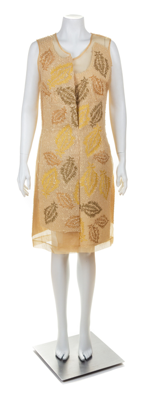 Fall/Winter 1997,with round neckline, sheer panels at the bodice and side seams, decorative metallic embroidery and a hidden back zip closure. Labeled: Comme des Garcons.