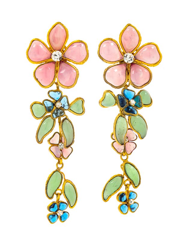 goldtone with a pink, green and blue floral design. Together with a box. Stamped: Chanel.