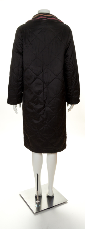 with a high neck collar, front flap pockets with partial button front closure and a logo quilted nylon on the reverse side. Labeled: Missoni.