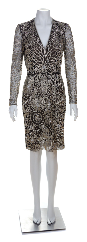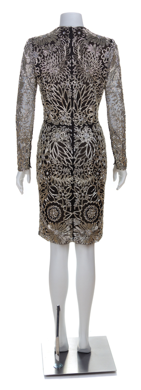 with sheer sleeves, a plunge neckline, a gathered waist and a straight skirt with a back zip closure. Labeled: Naeem Khan.