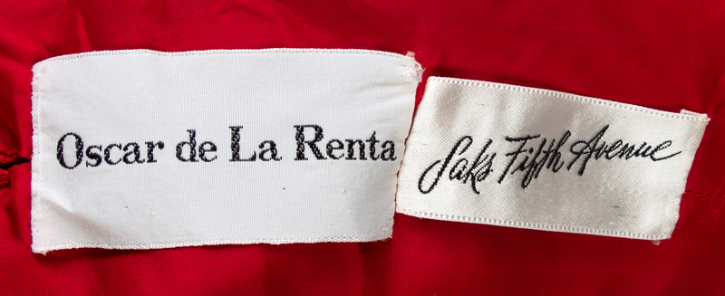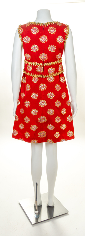 sleeveless with a decorative gold trim and beaded round neckline, an attached decorative belt, a side pleat skirt and a back zip closure. Labeled: Oscar de la Renta.