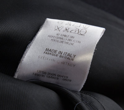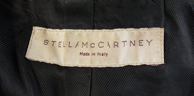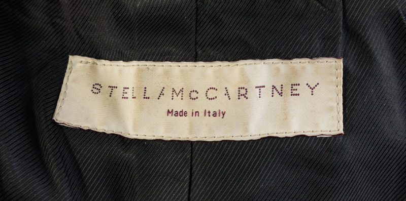 with a notched lapel, exaggerated sleeve cuffs, decorative faux front flap pockets and a belted waistband. Labeled: Stella McCartney.