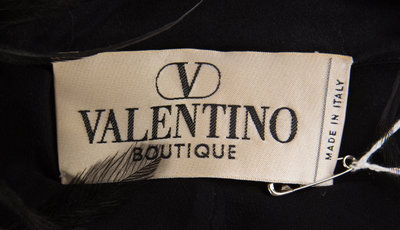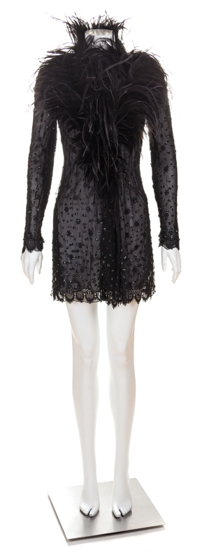 with decorative ostrich feathers at the collar, floral sequin embellishment and a decorative button closure at the waist.Labeled: Valentino.