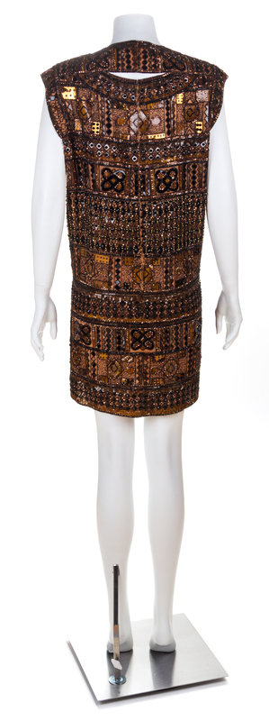 African Collection, sleeveless with a round neckline, brown, black and bronze bead and sequin embellished organza, a back zip closure and an upper back cutout with a hook and eye closure. Attributed to: Yves Saint Laurent.
