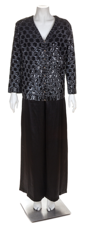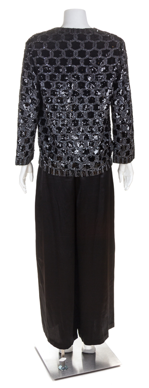 with a beaded and sequin circle link pattern, a V-neckline and a front button and loop closure; together with a black silk palazzo pant with front left side snap closure. Cardigan Labeled: Yves Saint Laurent. (Tape #32631)Pants attributed to: Yves Saint Laurent.