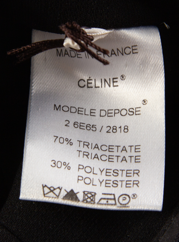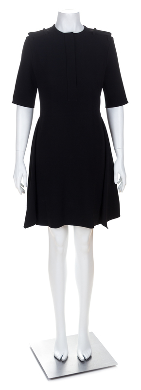 with a round neckline, epaulettes at the shoulder, partial hidden front button closure and decorative panels at the side and back hip.Labeled: Celine.