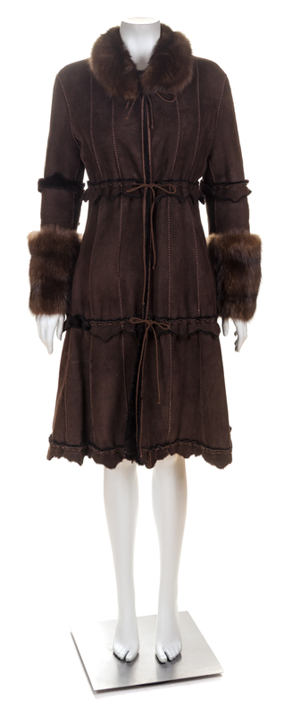 with a decorative fur collar and matching cuffs, a drawstring self-tie waist, suede and faux fur trim and fully lined in faux fur.Labeled: Dennis Basso.