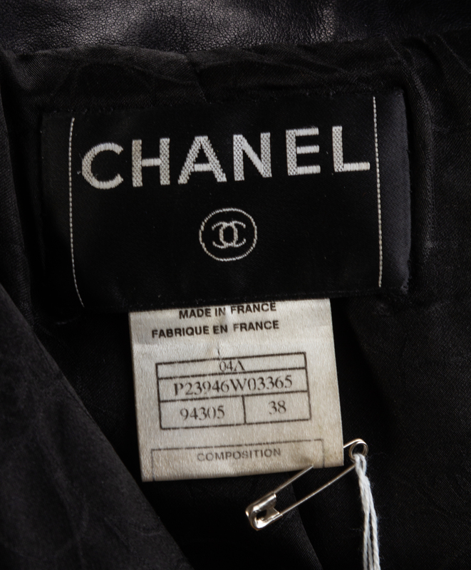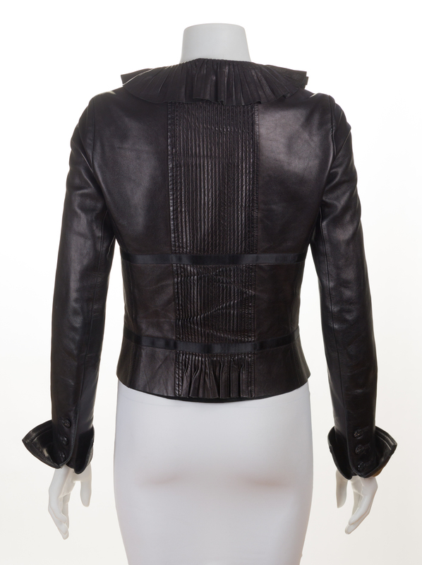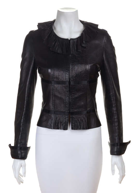 Fall/Winter 2004,with a pleated ruffle collar, pleating detail on the front, back and cuffs, black silk decorative front trim, a zip front closure and signature Chanel logo buttons at the sleeve hem.Labeled: Chanel.