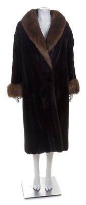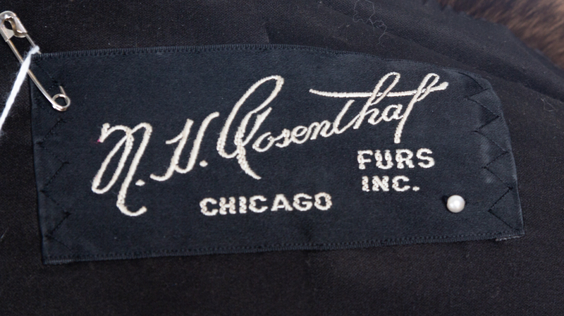 with a contrasting Fischer fur shawl lapel and cuffs, side slip pockets, hook and eye front closure and fully lined in black. Labeled: Bill Haire.